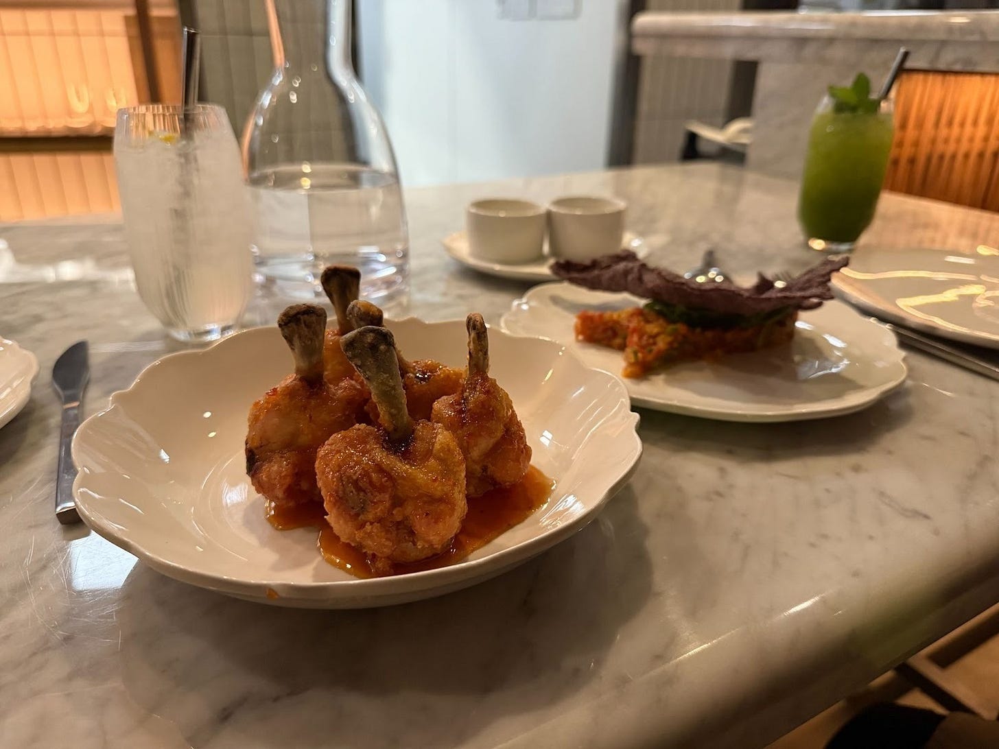 At some fusion restaurants, the mashup is loud, brash, and in-your-face. Here, Lelah and Kim opt for a far subtler marriage of Korean and Italian cuisines — so subtle, in fact, that the Koreanness of the menu was almost lost on me at certain points throughout the meal. Ingredients like jjajang (black bean sauce) and bulgogi (sweet soy marinade) are incorporated into (respectively) pasta Amatriciana and meatballs in tomato sauce, though the overall impact on the flavor is minimal. My favorite dish was the quartet of Calabrian chili fried chicken lollipops, which simply tasted like buffalo wings. –Patricia Kelly Yeo