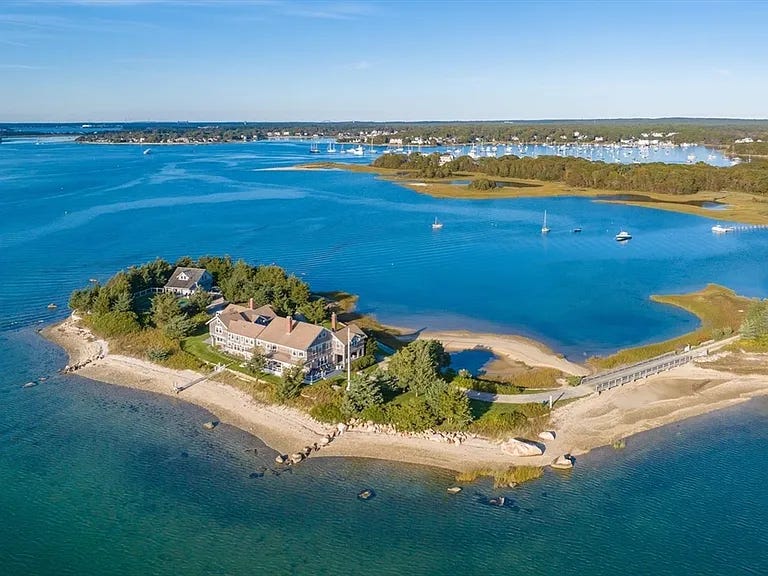 → 75 Winsor Rd (Bourne, above) • 4BR/4.1BA, 6839 SF house • Ask: $10.9M • Rocky Island, fully renovated in 2014, connected to the mainland by a wooden bridge • Days on market: 29 • Agent: G. Stewart Young, LandVest.