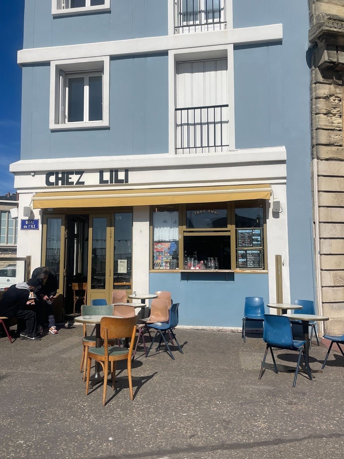 Right by the fish market in Le Havre, Chez Lili sits almost pressed against the rhythm of the harbor. A small terrace faces the fishing boats, tucked into a corner that catches the sun just right. On bright days, the pale blue-grey façade of the building seems to dissolve into the sky itself.