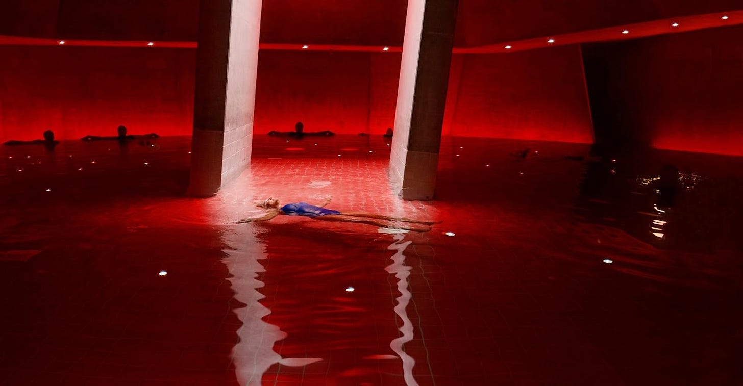 My favorite space, though, lies underground, in what feels like a bat cave: rough concrete walls, soaring ceilings, near darkness pierced by red neon light. At the center of the pool runs a narrow corridor beneath a single skylight. Here, the water is enriched to mimic the density of the Dead Sea, allowing you to float effortlessly in barely 40 centimeters of depth. With no effort required, all tension releases. Submerge your ears and listen to the Indian raga or soft jazz playing beneath the surface. Push gently off the edge and glide slowly beneath the skylight, weightless and suspended, a cinematic travelling. –Candice Chemel
