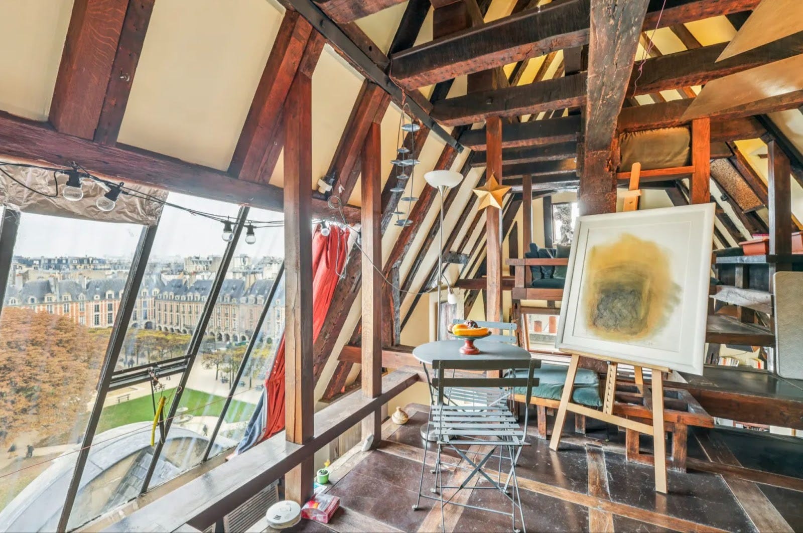 → Place des Vosges (metro Bastille, above) • 2BR/1BA, 1367 SF apartment • Ask: $3.6M • top floor at King’s Pavilion with artist’s loft vibes and ‘suspended’ living room • Agent: John Vingas, Engel & Völkers.