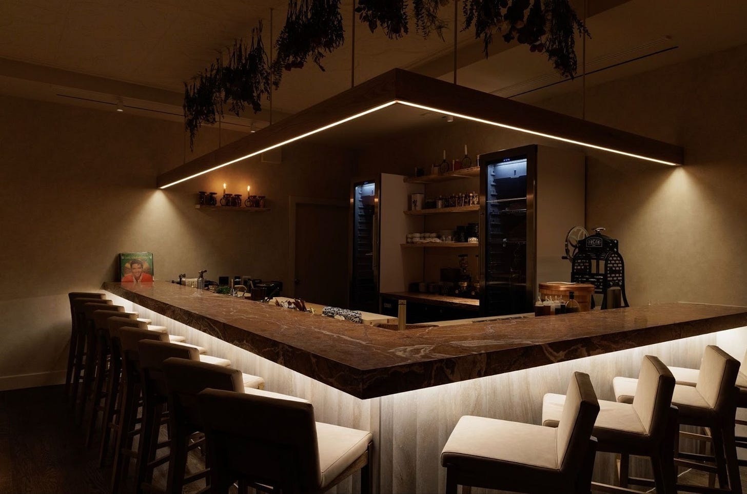 Walk straight through the 1940s-themed ground-floor lounge of The Concord Building (formerly nightlife destination Hotel Chantelle), where a sliding door at the back reveals the 10-seat restaurant. An L-shaped, salmon-pink marble counter anchors the sparse space, two dry-aging refrigerators parked within it. Ouimette and her all-female team, a sous chef and a beverage director, glide quietly through the compact room, pausing to flip a vinyl record now and then. –Kat Odell