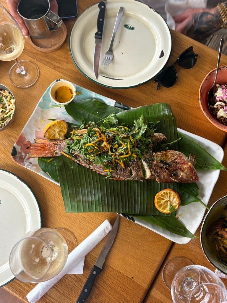 Finally, a local red snapper arrived, charred on a burén, a traditional Taíno cooking surface that references indigenous Caribbean techniques and pre-colonial foodways. The fish was adorned with heaps of fresh herbs, plus shreds of pickled chayote and pumpkin, and laid over banana leaves alongside charred lemon halves.